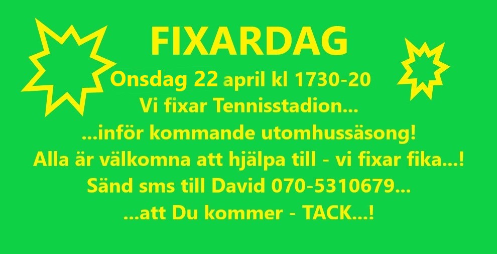 Fixardag på onsdag – snart utomhus…! På onsdagskvällen 22 april kl 1730-20 så hjälps vi åt att fixa på Tennisstadion och i det blåvita nästet. Anmäl till David via sms på 070-5310679 eller via Matchi att Du kommer så vi vet för korvgrillningen…! Välkomna…! 2025-04-18