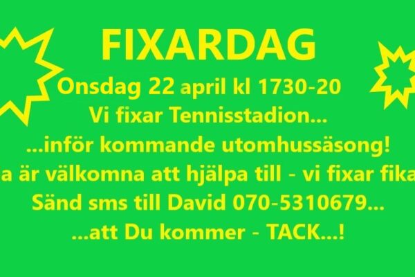 Fixardag på onsdag – snart utomhus…! På onsdagskvällen 22 april kl 1730-20 så hjälps vi åt att fixa på Tennisstadion och i det blåvita nästet. …